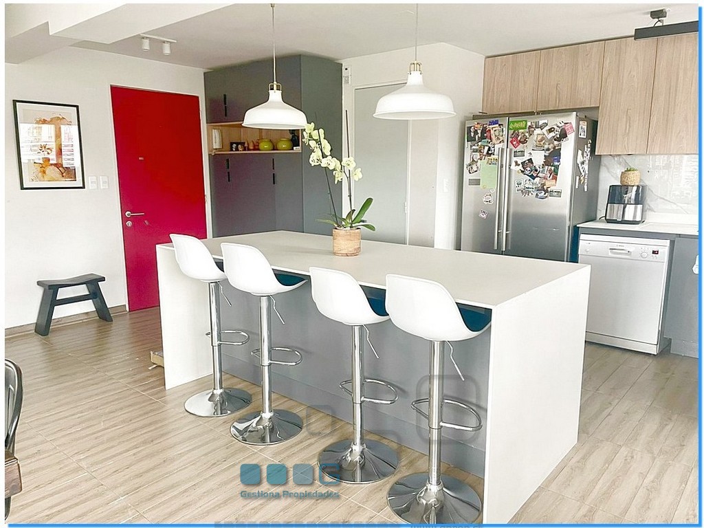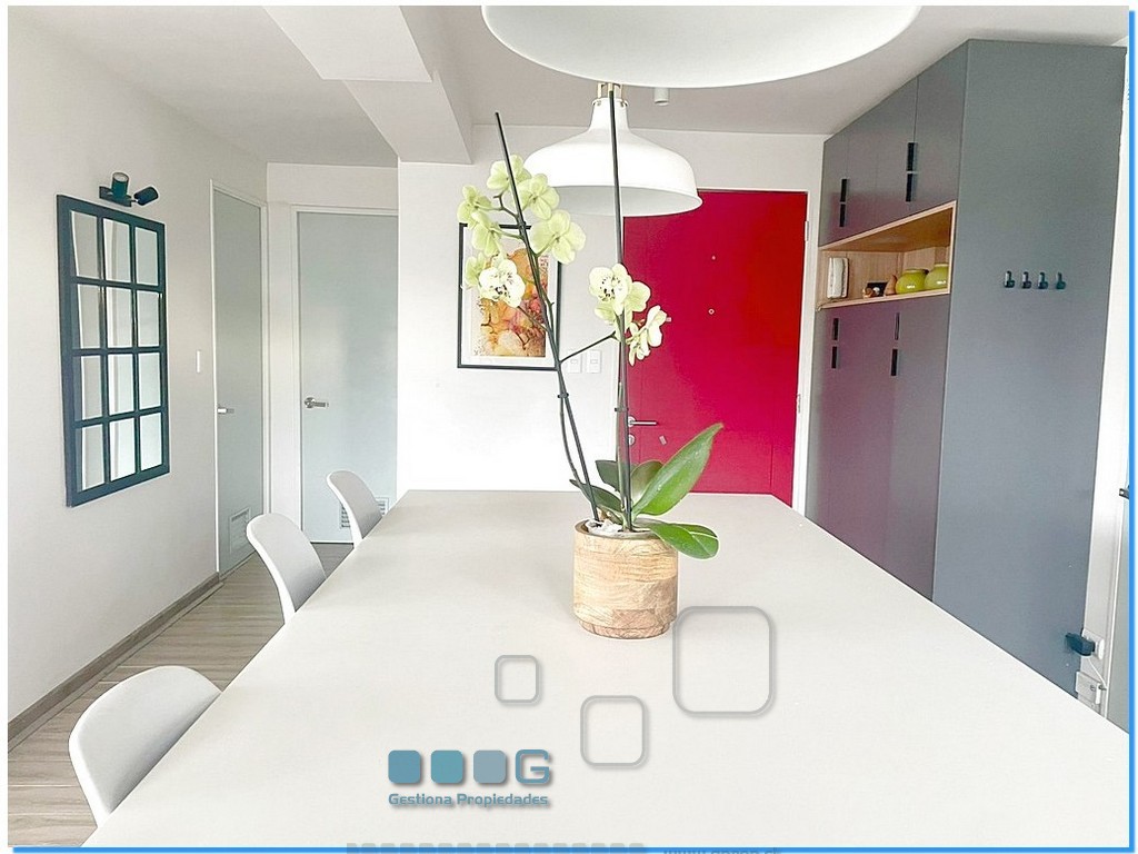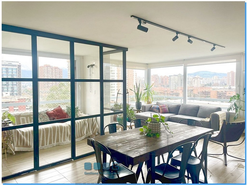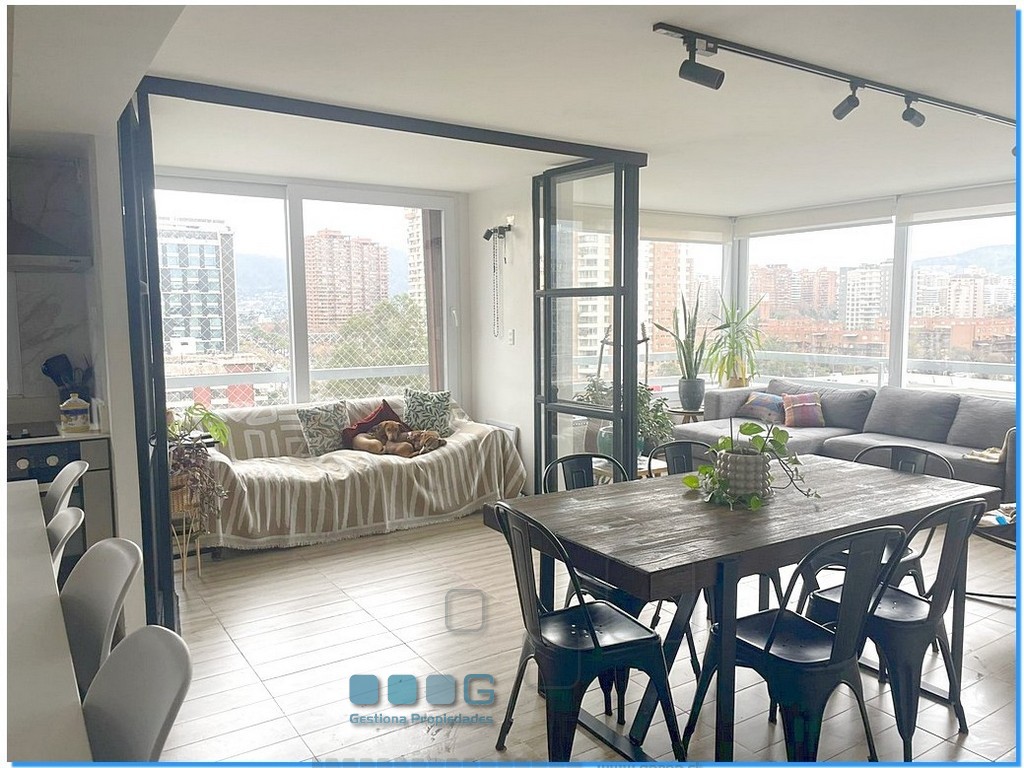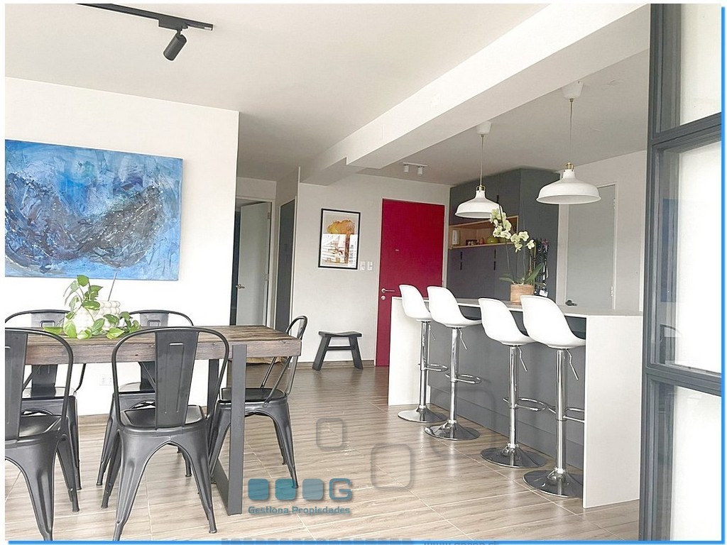 Hermoso y amplio departamento. Vista despejada, al nororiente. Amplios y luminosos recibos c/ cocina integrada. Logia. 2 amplios dormitorios con cortinas roller doble, Ppal.Suite. 2 baños. Aire acondicionado. Todo piso porcelanato. Estacionamiento, bodega